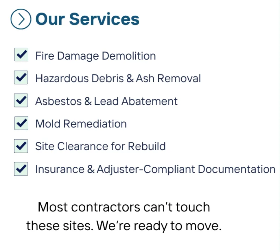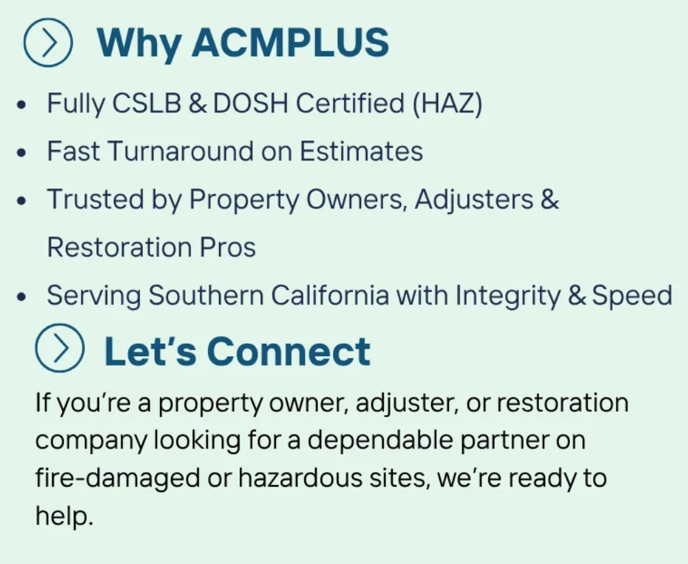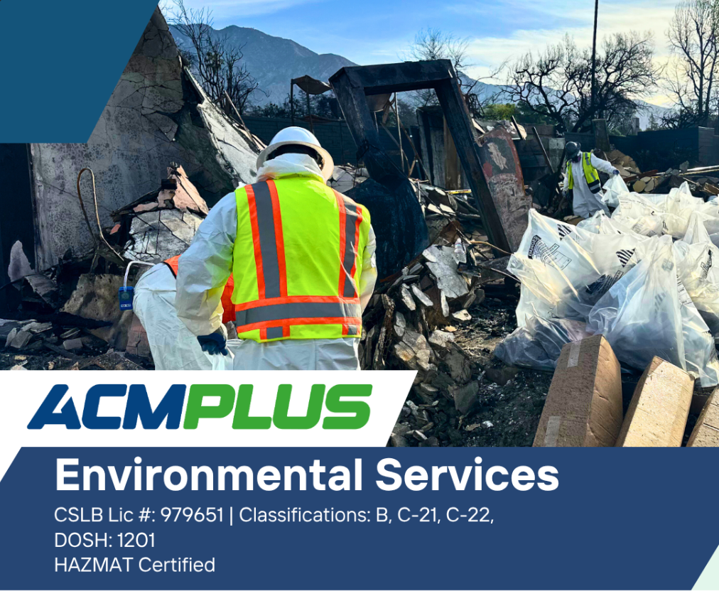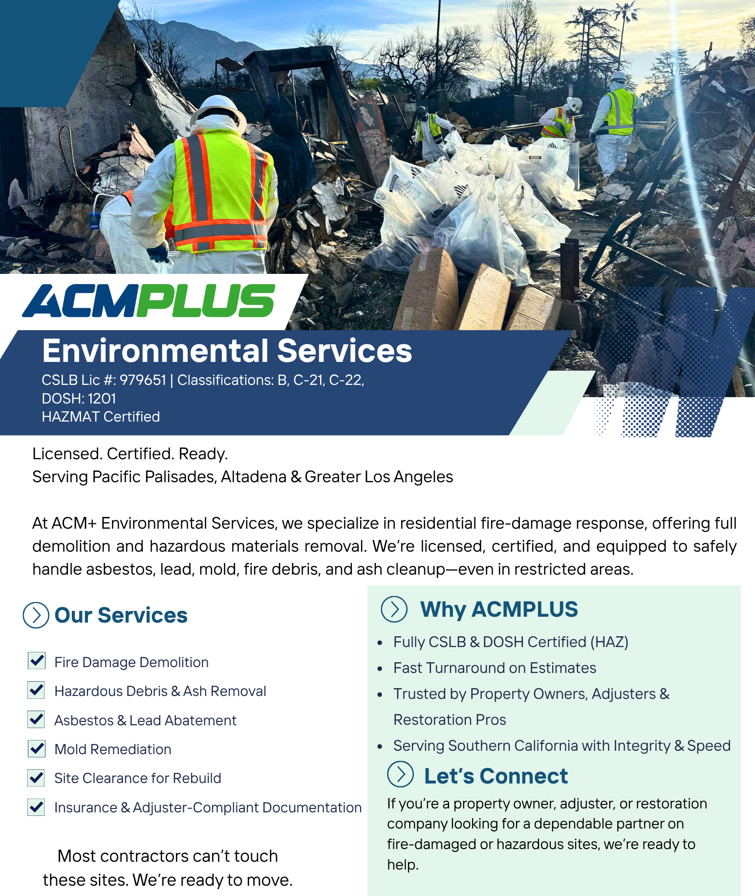 At ACM+ Environmental Services, we specialize in residential fire-damage response, offering full demolition and hazardous materials removal. We're licensed, certified, and equipped to safely handle asbestos, lead, mold, fire debris, and ash cleanup-even in restricted areas.